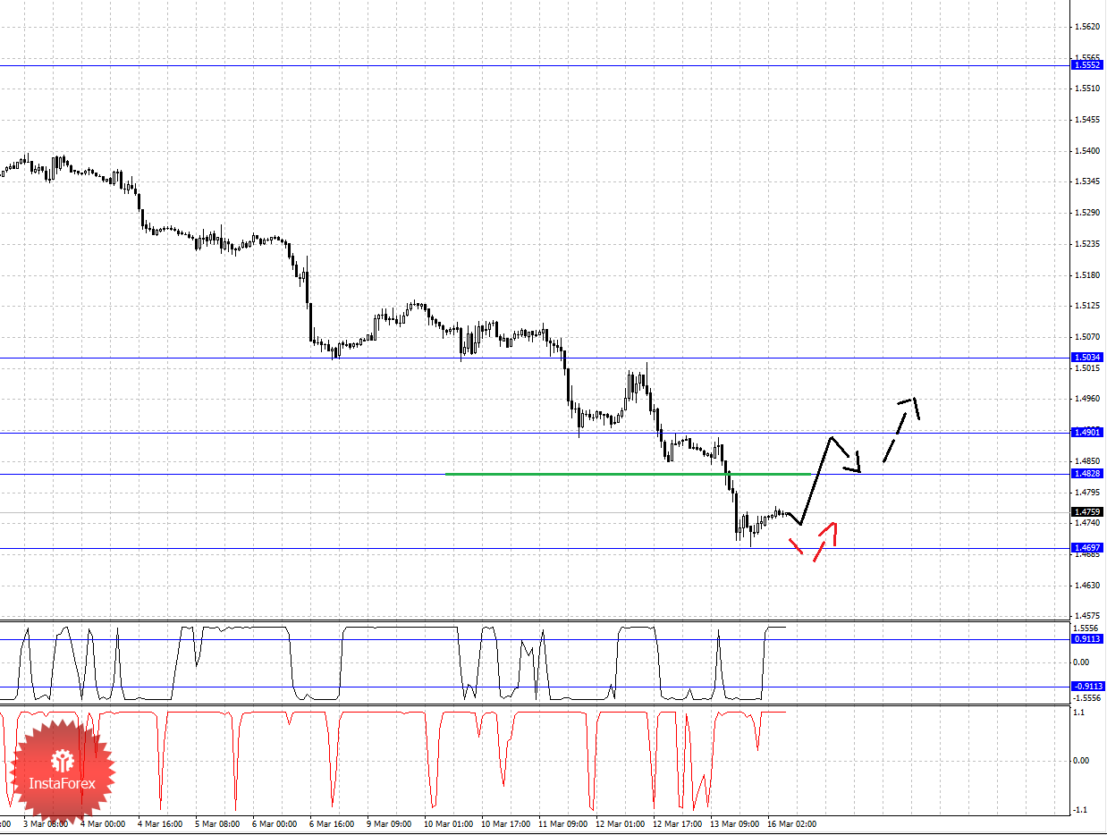 По паре Евро/Доллар ключевыми уровнями в масштабе Н1 являются: 1.0681, 1.0596, 1.0543, 1.0458, 1.0411 и 1.0332. Здесь от 12 марта формируется локальный потенциал для продолжения нисходящей тенденции, начальных условий для верха пока не наблюдаем. Краткосрочное нисходящее движение ожидаем в коридоре 1.0458 – 1.0411, пробой последнего значения позволит рассчитывать на движение к потенциальной цели – 1.0332, по достижении которого ожидаем откат кверху. Краткосрочное восходящее движение возможно в коридоре 1.0543 – 1.0596, пробой последнего значения позволит рассчитывать на формирование потенциала для восходящего движения, здесь цель – 1.0681.