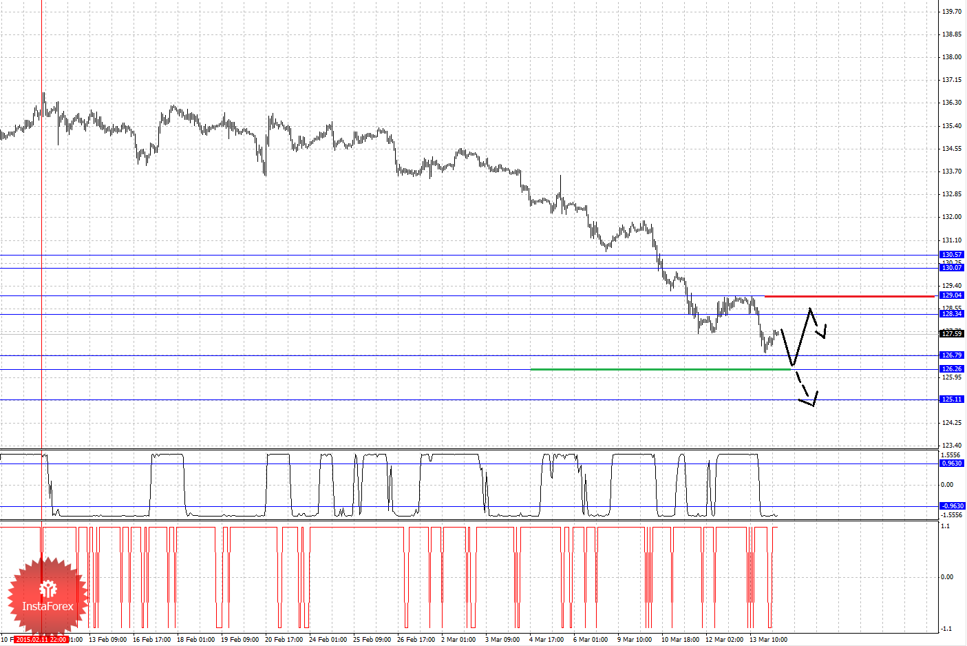 По паре Евро/Иена ключевыми уровнями в масштабе Н1 являются: 130.57, 130.07, 129.04, 128.34, 126.79, 126.26 и 125.11. Здесь продолжения движения книзу ожидаем после прохода ценой шумового диапазона 126.79 – 126.26, в данном случае цель – 125.11, по достижении этого уровня ожидаем откат кверху. Краткосрочное восходящее движение возможно в коридоре 128.34 – 129.04, пробой последнего значения будет располагать к формированию потенциала для восходящего цикла, в данном случае цель – 130.07. Диапазон 130.07 – 130.57 шумовой, до него ожидаем оформления начальных условий.