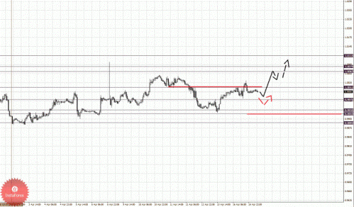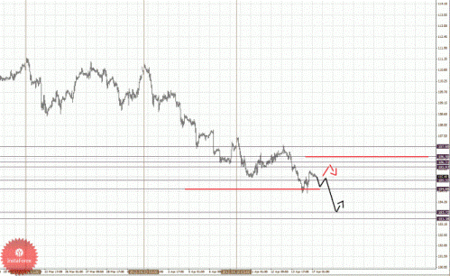 По паре Фунт/Доллар ключевыми уровнями являются: 1.5980, 1.5938, 1.5912, 1.5895, 1.5809, 1.5754, 1.5732 и 1.5688. Здесь цели пока остались без изменения, однако цена близка к уровням для отмены нисходящей структуры 12 апреля. Продолжения развития нисходящей структуры от 12 апреля ожидаем после пробоя 1.5809, в данном случае цель 1.5754, в коридоре 1.5754 – 1.5732 консолидация цены. Потенциальным значением для низа считаем уровень – 1.5688, по достижении которого, ожидаем откат кверху. Корректировочное восходящее движение возможно в коридоре 1.5895 – 1.5912, пробой последнего значения приведет к углубленному движению, здесь цель – 1.5938, от этого уровня высока вероятность разворота книзу, его пробой будет располагать к формированию восходящей структуры, в данном случае потенциальная цель – 1.5980.