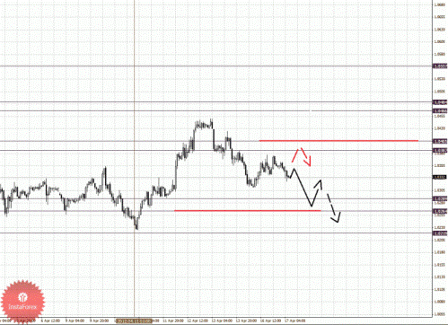 По паре Австралийский доллар/Доллар ключевыми уровнями являются: 1.0557, 1.0484, 1.0466, 1.0405, 1.0387, 1.0289, 1.0264 и 1.0219. Здесь диапазон 1.0289 – 1.0264 играет роль ключевой поддержки для восходящей структуры от 11 апреля, в нем мы ожидаем краткосрочное движение книзу, пробой уровня 1.0264 приведет к отмене восходящей структуры в масштабе Н1, в данном случае первая цель 1.0219. Продолжения движения кверху ожидаем после прохода ценой шумового диапазона 1.0387 – 1.0405, в данном случае цель 1.0466, в коридоре 1.0466 – 1.0484 консолидация цены. Потенциальным значением для верха считаем уровень 1.0557, движение к которому ожидаем после пробоя 1.0485.