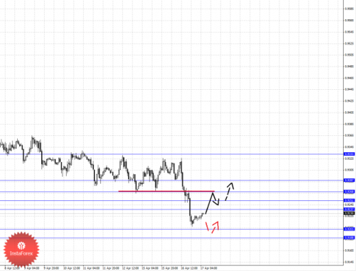 По паре Доллар/Франк ключевым уровня являются: 0.9333, 0.9287, 0.9268, 0.9252, 0.9237, 0.9203 и 0.9188. Здесь цена достигла основного предела для нисходящей структуры от 28 марта и мы ожидаем развития восходящей коррекции. Краткосрочное движение книзу возможно в диапазоне 0.9203 – 0.9188, отсюда высока вероятность разворота кверху, пробой уровня 0.9188 будет сопровождаться неустойчивым нисходящим движением, в данном случае цели, исходя из масштаба Н1, не определены. В масштабе Н4 потенциальным значением для низа считается уровень 0.9179. Краткосрочное восходящее движение ожидаем в коридоре 0.9237 – 0.9252, пробой последнего значения приведет к углубленной коррекции, здесь цель 0.9268, от этого уровня высока вероятность разворота книзу, его пробой окажет негативное влияние на развитие нисходящей тенденции в масштабе Н4, в данном случае цель – 0.9287. Уровень 0.9287 является ключевым сопротивлением для верха, его пробой позволит рассчитывать на формирование потенциальных начальных условий, в данном случае цель 0.9333.