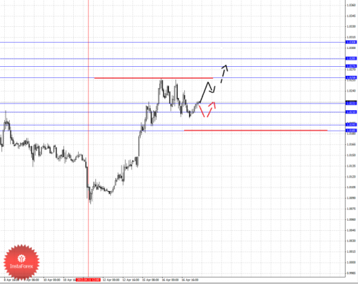 По паре Австралийский доллар/Доллар ключевыми уровнями являются: 1.0462, 1.0446, 1.0414, 1.0399, 1.0357, 1.0344, 1.0323, 1.0274, 1.0254 и 1.0222. Здесь от 15 апреля наблюдается потенциал для восходящего движения, однако цена на текущий момент находится в корректировочной зоне от нисходящей структуры 11 апреля. Выход из корректировочной зоны ожидаем после прохода ценой шумового диапазон 1.0399 – 1.0414, в данном случае цель 1.0446. Потенциальным значением для верха пока считаем уровень 1.0462, по достижении которого ожидаем консолидированное движение в коридоре 1.0446 – 1.0462. Краткосрочное нисходящее движение возможно в коридоре 1.0357 – 1.0344, пробой последнего значения приведет к углубленному движению, здесь цель 1.0323, этот уровень является ключевым сопротивлением для продолжения развития нисходящей структуры, в данном случае первая потенциальная цель – 1.0274.