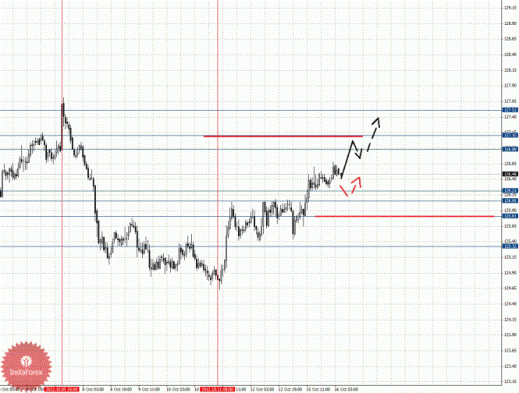 По паре Фунт/Иена ключевыми уровнями являются: 128.24, 127.74, 127.51, 127.10, 125.59, 126.33, 126.07 и 125.39. Здесь продолжения развития восходящей структуры от 11 октября ожидаем после пробоя 127.10, в данном случае цель 127.51, в коридоре 127.51 – 127.74 консолидация цены. Потенциальным значением для верха считаем уровень 128.24, движение к которому ожидаем после пробоя 127.75. Краткосрочное нисходящее движение возможно в коридоре 126.59 – 126.33, пробой последнего значения приведет к углубленной коррекции, здесь цель 126.07, до этого уровня мы ожидаем оформления начальных условий для нисходящего цикла.