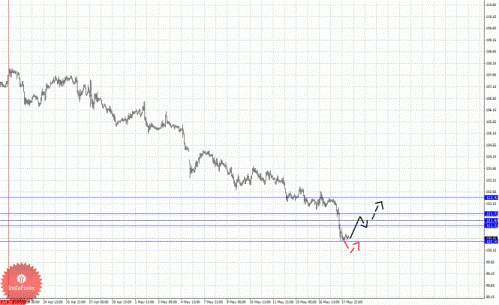 По паре Доллар/Йена ключевыми уровнями являются: 79.97, 79.77, 79.62, 79.15, 78.88 и 78.47. Здесь цена отменила развитие восходящего цикла от 9 мая. Краткосрочное нисходящее движение ожидаем в коридоре 79.15 – 78.88, пробой последнего значения позволит рассчитывать на движение к потенциальной цели – 78.47, по достижении которого ожидаем откат кверху. Краткосрочное восходящее движение возможно в коридоре 79.62 – 79.77, пробой последнего значения приведет к углубленной коррекции, здесь цель 79.97, до этого уровня ожидаем оформления начальных условий для восходящего цикла.