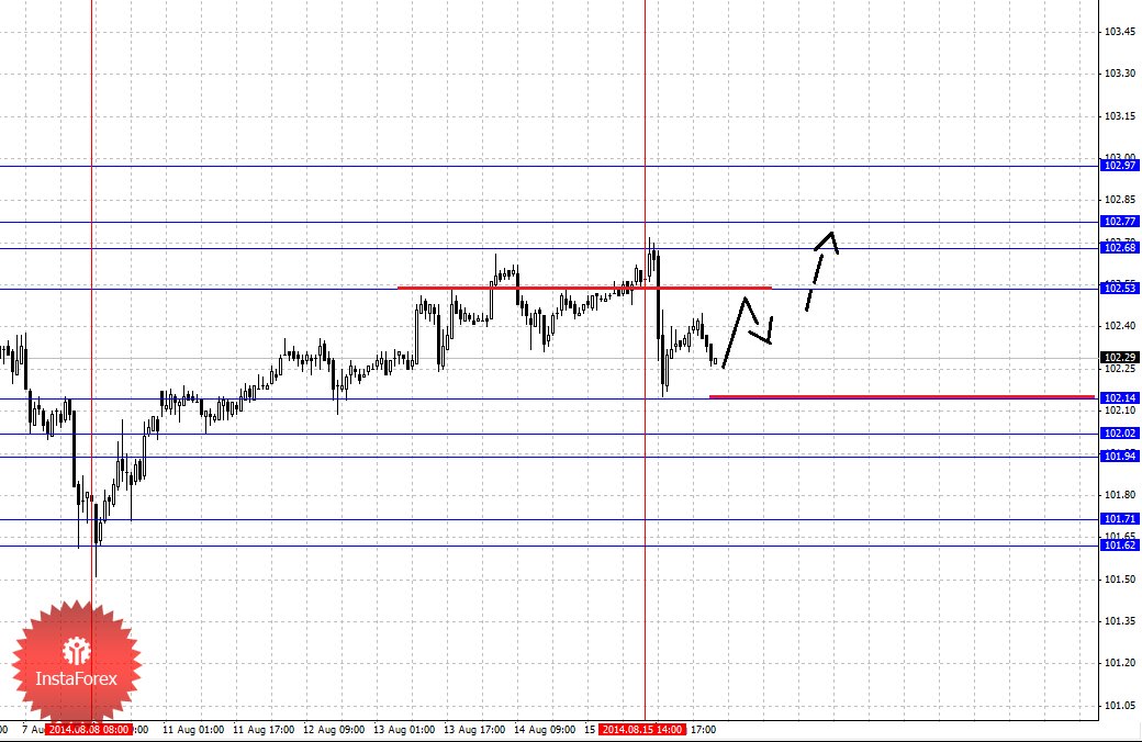 По паре Доллар/Иена ключевыми уровнями в масштабе Н1 являются: 102.97, 102.77, 102.68, 102.53, 102.14, 102.02, 101.94, 101.71 и 101.62. Здесь от 15 августа формируется потенциал для нисходящего движения в коррекции от основной тенденции. Продолжения движения книзу ожидаем после пробоя 102.14, здесь цель – 102.02, возле этого уровня консолидация цены. Проход ценой шумового коридора 102.02 – 101.94 должен сопровождаться выраженным движением книзу, здесь цель – 101.71. Потенциальным значением для низа считаем уровень 101.62, по достижении которого ожидаем консолидацию. Уровень 102.53 является ключевым сопротивлением для развития восходящей структуры, его проход ценой будет располагать к развитию восходящей структуры, здесь цель – 102.68, в коридоре 102.68 – 102.77 консолидация. Потенциальным значением для верха считаем уровень 102.97.
