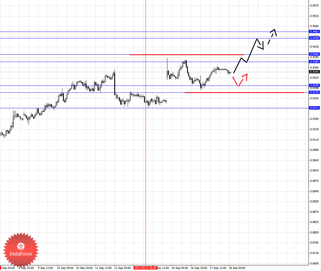 По паре Доллар/Франк ключевым уровня являются: 0.9342, 0.9315, 0.9290, 0.9277, 0.9228, 0.9212, 0.9189, 0.9171 и 0.9144. Здесь мы продолжаем следить за нисходящей структурой от 5 сентября. Продолжения движения книзу ожидаем после прохода ценой шумового диапазона 0.9228–0.9212, в данном случае цель – 0.9189, в коридоре 0.9189–0.9171 консолидация цены. Потенциальным значением для низа считаем уровень 0.9144, по достижении которого ожидаем откат кверху. Краткосрочное восходящее движение возможно в коридоре 0.9277–0.9290, пробой последнего значения будет располагать к формированию восходящей структуры, в данном случае цель - 0.9315. В качестве потенциального значения для верха пока рассматриваем уровень 0.9342.