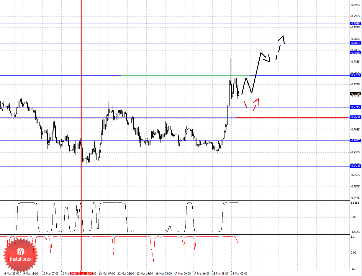 По паре Австралийский доллар/Доллар ключевыми уровнями в масштабе Н1 являются: 0.7935, 0.7884, 0.7858, 0.7799, 0.7715, 0.7688 и 0.7627. Здесь мы следим за развитием восходящего цикла от 11 марта. Продолжения движения кверху ожидаем после пробоя 0.7800, в данном случае цель – 0.7858, возле этого уровня консолидация цены. Проход ценой шумового диапазона 0.7858 – 0.7884 позволит рассчитывать на движение к потенциальной цели – 0.7935, по достижении которого ожидаем откат книзу. Краткосрочное нисходящее движение возможно в коридоре 0.7715 – 0.7688, пробой последнего значения приведет к углубленной коррекции, здесь цель – 0.7627, этот уровень является ключевой поддержкой для верха.