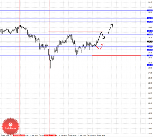 По паре Евро/Иена ключевыми уровнями являются: 133.01, 131.95, 131.45, 130.16, 129.68, 128.01, 127.57, 126.77 и 125.46. Здесь цена находится в равновесной ситуации, что вызвано формированием потенциала для верха от 15 апреля. Продолжения развития восходящей структуры ожидаем после прохода ценой шумового диапазона 129.68 – 130.16, в данном случае цель 131.45, в коридоре 131.45 – 131.95 консолидация цены. Потенциальным значением для верха считаем уровень 133.01, по достижении которого ожидаем откат книзу. Краткосрочное нисходящее движение возможно в коридоре 128.01 – 127.57, пробой последнего значения приведет к углубленной коррекции, здесь ель 126.77, от этого уровня мы ожидаем последний ключевой разворот кверху, его пробой продолжит развитие нисходящей структуры от 11 апреля, в данном случае первая потенциальная цель – 125.46.