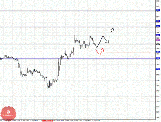 По паре Доллар/Иена ключевыми уровнями являются: 79.59, 79.28, 79.14, 78.88, 78.74, 78.41, 78.23 и 77.92. Здесь мы продолжаем следить за восходящей структурой от 13 сентября. Продолжения движения кверху ожидаем после прохода ценой шумового диапазона 78.74 – 78.88, в данном случае цель 79.14, в коридоре 79.14 – 79.28 консолидация цены. Потенциальным значением для верха считаем уровень 79.59, по достижении которого ожидаем откат книзу. Краткосрочное нисходящее движение возможно в коридоре 78.41 – 78.23, отсюда высока вероятность разворота кверху. Пробой уровня 78.20 окажет негативное влияние на развитие восходящей структуры от 13 сентября, здесь потенциальная цель – 77.92.