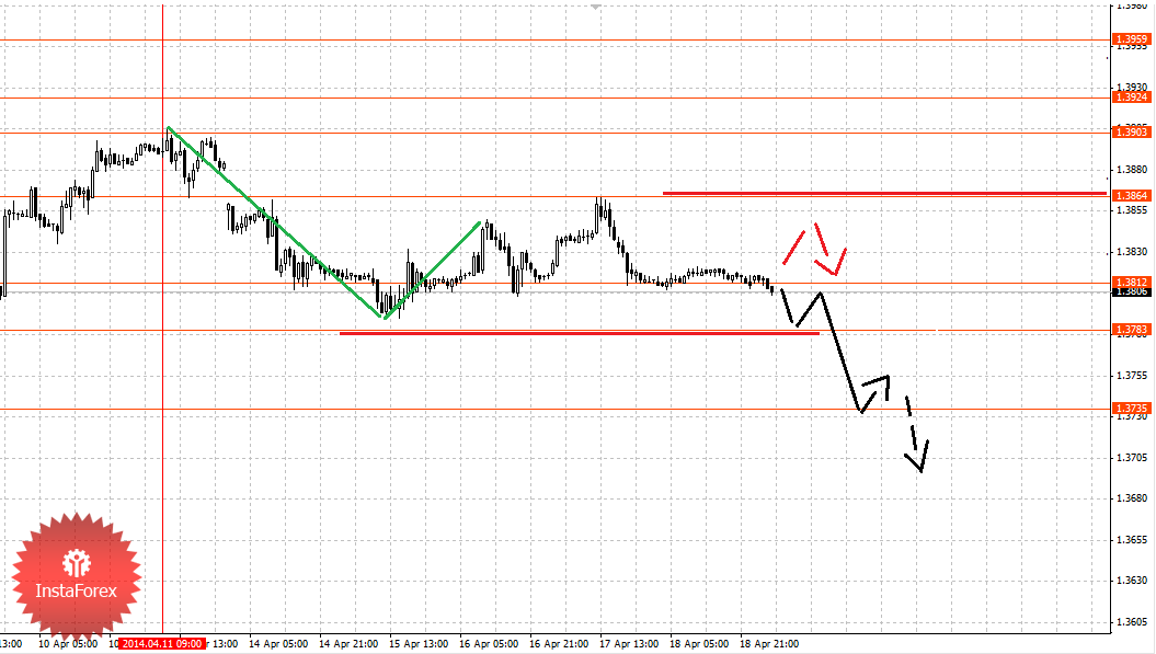 По паре Евро/Доллар ключевыми уровнями в масштабе Н1 являются: 1.3959, 1.3924, 1.3903, 1.3864, 1.3812, 1.3783 и 1.3735. Здесь цели остались без изменения, ожидаем развития нисходящей структуры от 11 апреля. Диапазон 1.3812 – 1.3783 является ключевой поддержкой для верха, из него высока вероятность разворота кверху, его проход будет располагать к развитию нисходящей структуры, здесь потенциальная цель – 1.3735. Развитие восходящей структуры ожидаем после пробоя 1.3864, здесь цель – 1.3903, в коридоре 1.3903 – 1.3924 краткосрочное движение, пробой последнего значения должен сопровождаться выраженным восходящим движением, здесь цель – 1.3959, от этого уровня ожидаем откат в коррекцию.