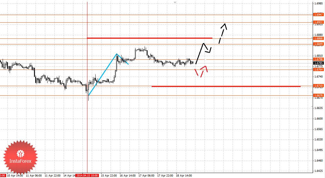 По паре Фунт/Доллар ключевыми уровнями в масштабе Н1 являются: 1.6947, 1.6922, 1.6868, 1.6849, 1.6798, 1.6764, 1.6710 и 1.6678. Здесь от 15 апреля оформились локальные начальные условия для верха. Продолжения развития восходящей тенденции ожидаем после прохода ценой шумового диапазона 1.6849 – 1.6868, в данном случае цель – 1.6922. Потенциальным значением для верха считаем уровень 1.6947, по достижении которого ожидаем консолидацию. Краткосрочное нисходящее движение возможно в коридоре 1.6798 – 1.6764, отсюда высока вероятность разворота кверху, пробой уровня 1.6764 окажет негативное влияние на развитие восходящей структуры, здесь цель – 1.6710. Диапазон 1.6710 – 1.6678 шумовой, до него ожидаем оформления потенциала для нисходящего цикла.