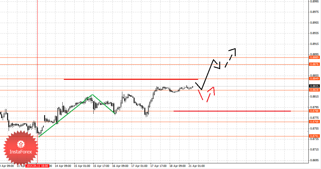 По паре Доллар/Франк ключевыми уровнями в масштабе Н1 являются: 0.8889, 0.8876, 0.8849, 0.8828, 0.8788, 0.8768 и 0.8741. Здесь восходящую структуру от 11 апреля мы рассматриваем в качестве потенциальных начальных условий для восходящего цикла. Продолжения движения кверху ожидаем после пробоя 0.8828, в данном случае цель – 0.8849, возле этого уровня консолидация цены. Пробой уровня 0.8849 должен сопровождаться выраженным восходящим движением, здесь цель – 0.8876. Потенциальным значением для верха считаем уровень 0.8889, по достижении которого, ожидаем консолидацию. Краткосрочное нисходящее движение, возможно в коридоре 0.8788 – 0.8768, пробой последнего значения будет располагать к развитию нисходящей структуры, в данном случае цель – 0.8741.