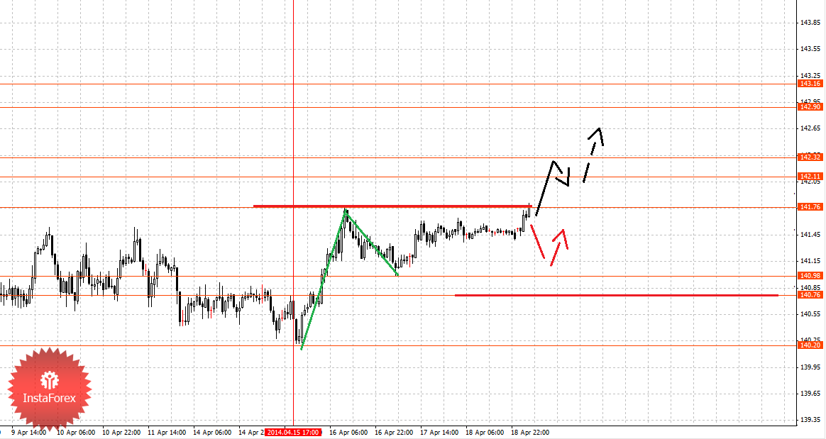 По паре Евро/Иена ключевыми уровнями в масштабе Н1 являются: 143.16, 142.90, 142.32, 142.11, 141.76, 140.98, 140.76 и 140.20. Здесь оформилась локальная структура для верха от 15 апреля. Продолжения движения кверху ожидаем после пробоя 141.76, в данном случае цель – 142.11, возле этого уровня консолидация цены. Проход ценой шумового диапазона 142.11 – 142.32 должен сопровождаться выраженным восходящим движением, здесь цель – 142.90. Потенциальным значением для верха считаем уровень 143.16, по достижении которого ожидаем консолидацию. Краткосрочное нисходящее движение возможно в коридоре 140.98 – 140.76, отсюда ожидаем ключевой разворот кверху, пробой уровня 140.76 окажет негативное влияние на формирование восходящей структуры, в данном случае потенциальная цель – 140.20.
