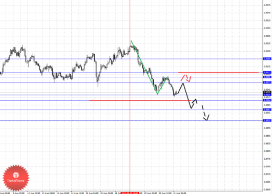 По паре Австралийский доллар/Доллар ключевыми уровнями являются: 0.9166, 0.9112, 0.9095, 0.9073, 0.9025, 0.9004, 0.8967 и 0.8925. Здесь мы следим за локальной нисходящей структурой от 19 августа, восходящую тенденцию от 5 августа рассматриваем в качестве долгосрочной структуры, ее отмены ожидаем после пробоя 0.8967. Краткосрочное нисходящее движение возможно в коридоре 0.9025– 0.9004, пробой последнего значения должен сопровождаться выраженным нисходящим движением, в данном случае цель 0.8967, возле этого уровня консолидация цены. Потенциальным значением для низа, считаем уровень 0.8925, по достижении которого ожидаем откат кверху. Краткосрочное восходящее движение возможно после пробоя 0.9075, здесь цель 0.9095. Диапазон 0.9095–0.9112 является ключевой поддержкой для развития нисходящего движения, из него высока вероятность разворота книзу. Пробой уровня 0.9112 будет располагать к развитию восходящей структуры, в данном случае потенциальная цель – 0.9166.