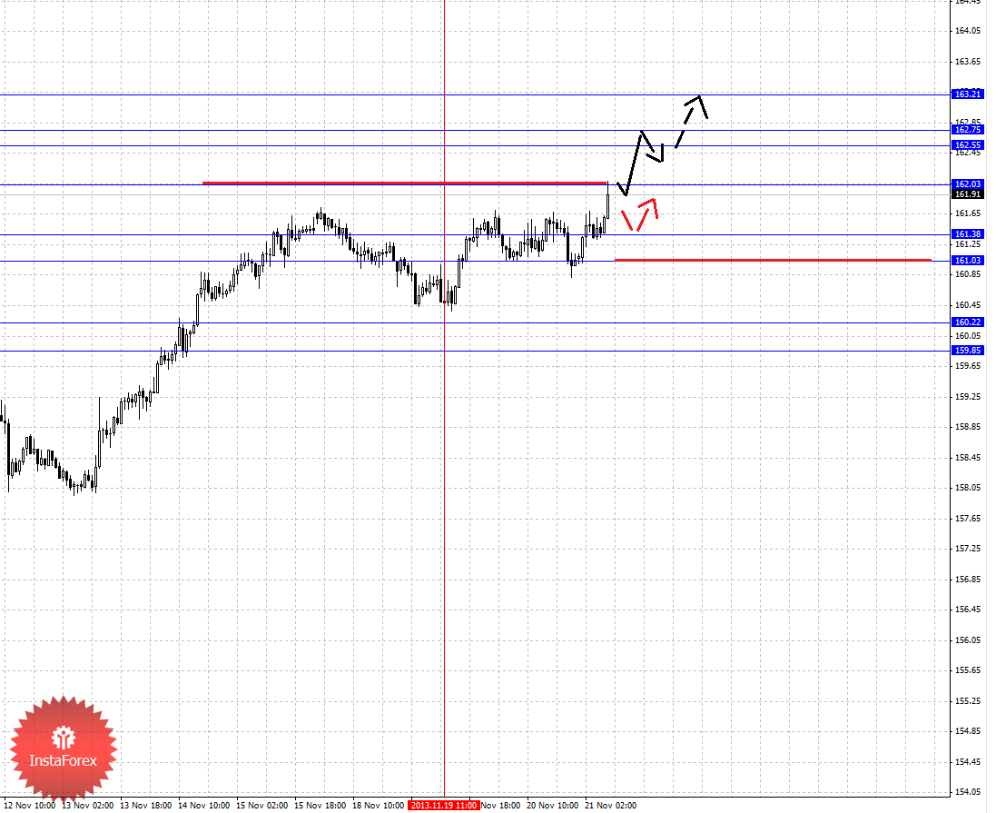 По паре Фунт/Иена ключевыми уровнями являются: 163.21, 162.75, 162.55, 162.03, 161.38, 161.03, 160.22 и 159.85. Здесь мы детализировали ключевые цели для восходящего движения от структуры 19 ноября. Продолжения движения кверху ожидаем после пробоя 162.05, в данном случае цель 162.55, в коридоре 162.55 – 162.75 консолидация цены. Потенциальным значением для верха считаем уровень 163.21, по достижении которого ожидаем консолидацию. Краткосрочное нисходящее движение возможно в коридоре 161.38 – 161.03, пробой последнего значения будет располагать к развитию нисходящего движения, здесь цель – 160.22. Диапазон 160.22 – 159.85 шумовой, до него ожидаем оформления начальных условий для нисходящего цикла.