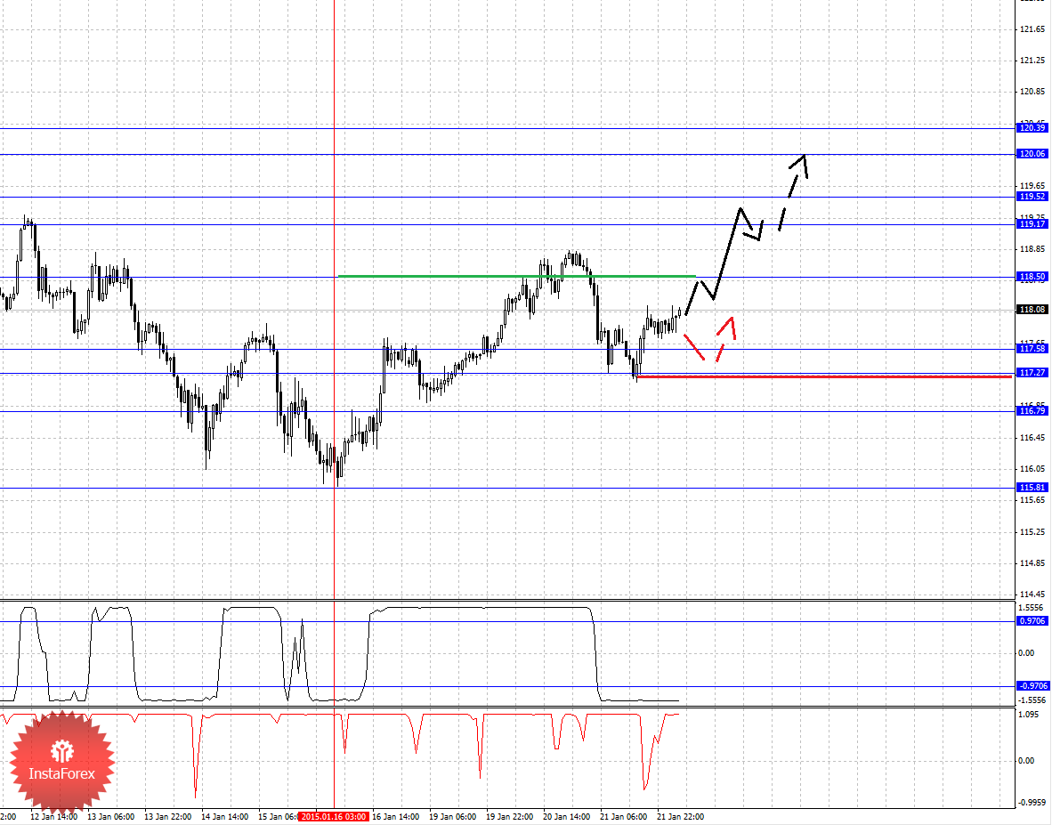 По паре Доллар/Иена ключевыми уровнями в масштабе Н1 являются: 120.39, 120.06, 119.52, 119.17, 118.50, 117.58, 117.27 и 116.79. Здесь мы продолжаем следить за восходящей структурой от 16 января. Продолжения движения кверху ожидаем после пробоя 118.50, здесь первая цель – 119.17. Краткосрочное восходящее движение, ожидаем в коридоре 119.17 – 119.52, пробой последнего значения должен сопровождаться выраженным движением, здесь цель – 120.06. Потенциальным значением для верха,считаем уровень 120.39, по достижении которого ожидаем консолидацию. Краткосрочное нисходящее движение возможно в коридоре 117.58 – 117.27, пробой последнего значения приведет к углубленной коррекции, здесь цель – 116.79, этот уровень является ключевой поддержкой для восходящей структуры.