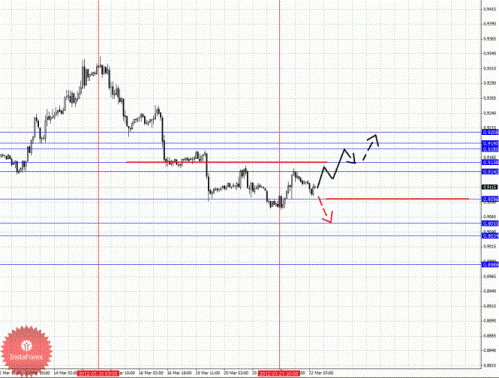 По паре Доллар/Франк ключевым уровня являются: 0.9208, 0.9190, 0.9180, 0.9158, 0.9142, 0.9096, 0.9055, 0.9034 и 0.8986. Здесь от 21 марта формируется небольшой потенциал для развития восходящего движения. Краткосрочное движение кверху ожидаем в диапазоне 0.9142 – 0.9158, пробой последнего значения приведет к выраженному движению, в данном случае цель 0.9180. В коридоре 0.9180 – 0.9190 консолидация цены. Потенциальным значением для верха считаем уровень 0.9208, по достижении которого ожидаем откат книзу. Уровень 0.9096 является ключевым сопротивлением для продолжения нисходящего движения, его пробой позволит рассчитывать на движение к 0.9055, в коридоре 0.9055 – 0.9034 консолидация цены. Потенциальным значением для низа считаем уровень 0.8986, движение к которому ожидаем после пробоя 0.9034.