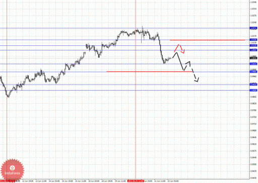 По паре Евро/Йена ключевыми уровнями являются: 102.71, 102.19, 101.95, 101.57, 99.95, 99.78, 99.55 и 99.06. Здесь мы следим за формированием восходящей структуры от 18 июня. Продолжения движения кверху ожидаем после пробоя 101.57, в данном случае цель – 101.95, в коридоре 101.95 – 102.19 консолидация цены. Потенциальным значением для верха считаем уровень 102.71, по достижении которого ожидаем откат книзу. Краткосрочное нисходящее движение ожидаем в коридоре 99.95 – 99.78, пробой последнего значения приведет к углубленному движению, в данном случае цель 99.55, от этого уровня высока вероятность разворота кверху, его пробой будет располагать к развитию нисходящей структуры, здесь цель – 99.06.