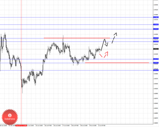 По паре Доллар/Франк ключевым уровня являются: 0.9720, 0.9633, 0.9581, 0.9538, 0.9407, 0.9384, 0.9322 и 0.9192. Здесь нисходящую структуру от 9 июля мы рассматриваем в качестве потенциальных начальных условий. Продолжения движения книзу ожидаем после прохода ценой шумового диапазона 0.9407–0.9384, в данном случае цель – 0.9322, возле этого уровня консолидация цены. Пробой 0.9322 должен сопровождаться выраженным нисходящим движением, в данном случае цель 0.9192, по достижении которого ожидаем консолидацию. Корректировочное восходящее движение возможно в коридоре 0.9538–0.9581, пробой последнего значения приведет к углубленному движению, здесь цель – 0.9633, от этого уровня высока вероятность разворота книзу, его пробой будет располагать к развитию восходящей структуры, в данном случае цель – 0.9720.