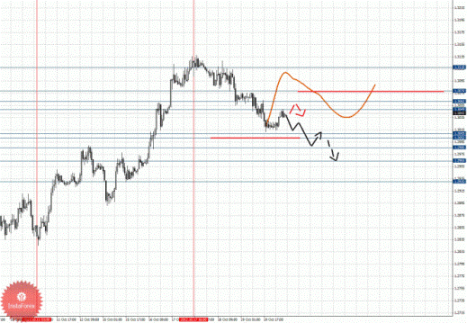 По паре Евро/Доллар важными уровнями являются: 1.3118, 1.3079, 1.3062, 1.3049, 1.3009, 1.3002, 1.2986, 1.2964 и 1.2930. Здесь продолжения движения книзу ожидаем после прохода ценой шумового диапазона 1.3009 – 1.3002, в данном случае цель 1.2986, возле этого уровня консолидация цены. Пробой 1.2986 позволит рассчитывать на движение к 1.2964, по достижении которого также ожидаем консолидацию. Потенциальным значением для нисходящей структуры от 17 октября считаем уровень 1.2930, от которого ожидаем откат кверху. Краткосрочное восходящее движение возможно в коридоре 1.3049 – 1.3062, пробой последнего значения приведет к углубленному движению, здесь цель 1.3079, от этого уровня высока вероятность разворота книзу, его пробой будет располагать к формированию восходящей структуры, в данном случае потенциальная цель – 1.3118.