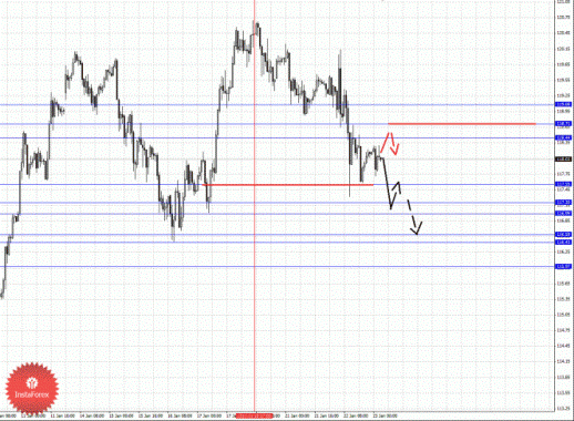 По паре Евро/Иена ключевыми уровнями являются: 119.08, 118.71, 118.44, 117.55, 117.20, 116.99, 116.59, 116.43 и 115.97. Здесь мы следим за развитием нисходящего цикла от 18 января. Продолжения движения книзу ожидаем после пробоя 117.55, в данном случае цель 117.20, в коридоре 117.20 – 116.99 консолидация цены. Пробой уровня 116.99 будет сопровождаться выраженным нисходящим движением, в данном случае цель 116.59, в коридоре 116.59 – 116.43 консолидация цены. Потенциальным значением для низа считаем уровень 115.97, движение к которому ожидаем после пробоя 116.43. Краткосрочное восходящее движение возможно в коридоре 118.44 – 118.71, пробой последнего значения приведет к углубленному движению, здесь цель 119.08, до этого уровня мы ожидаем оформления начальных условий для восходящего цикла.
