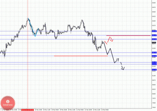 По паре Доллар/Йена ключевыми уровнями являются: 83.45, 83.22, 83.00, 82.27, 82.09, 81.73, 81.63 и 81.33. Здесь мы следим за нисходящим циклом от 15 марта. Краткосрочное движение книзу ожидаем в диапазоне 82.27 – 82.09, пробой последнего значения должен сопровождаться выраженным нисходящим движением к уровню 81.73, в коридоре 81.73 – 81.63 консолидация цены. Потенциальным значением для низа считаем уровень 81.33, по достижении которого ожидаем откат кверху. Краткосрочное восходящее движение возможно после пробоя 83.00, в данном случае цель 83.22, возле этого уровня ожидаем консолидацию. Пробой 82.33 позволит рассчитывать на движение к потенциальной цели – 83.45, до этого уровня ожидаем оформления начальных условий для движения кверху.