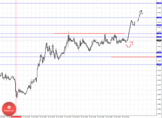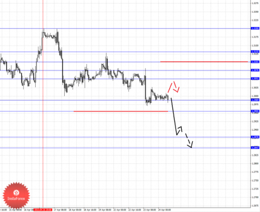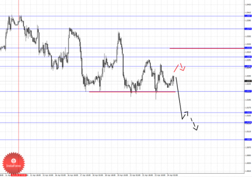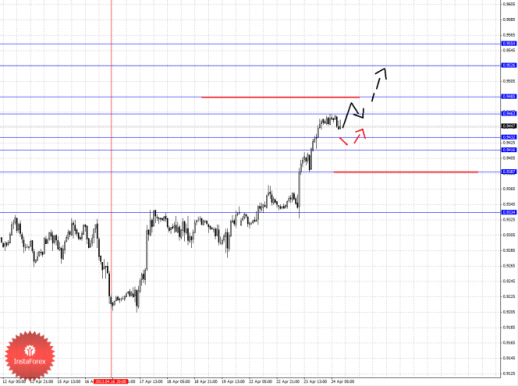 По паре Доллар/Канадский доллар ключевыми уровнями являются: 1.0380, 1.0335, 1.0311, 1.0285, 1.0274, 1.0226, 1.0213 и 1.0189. Здесь восходящую структуру от 11 апреля мы рассматриваем в качестве долгосрочных начальных условий. Продолжения движения кверху ожидаем после прохода ценой шумового диапазона 1.0274 – 1.0285, в данном случае цель 1.0311, пробой которого, в свою очередь, позволит рассчитывать на движение к 1.0335, возле этого уровня консолидация цены. Потенциальным значением для верха считаем уровень 1.0380, движение к которому ожидаем после пробоя 1.0335. Диапазон 1.0226 – 1.0213 является ключевой поддержкой для восходящей структуры, в нем ожидаем краткосрочное нисходящее движение, в также отсюда высока вероятность разворота к верху. Пробой уровня 1.0210 окажет негативное влияние на формирование восходящей тенденции в масштабе Н1, в данном случае потенциальная цель – 1.0189.