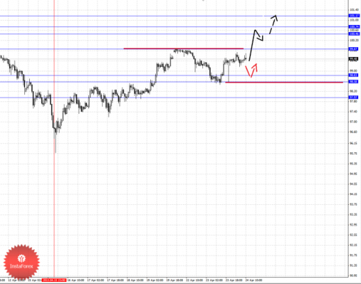 По паре Доллар/Иена ключевыми уровнями являются: 101.17, 100.74, 100.46, 99.87, 98.83, 98.58 и 97.97. Здесь мы следим за восходящим циклом от 15 апреля. Продолжения движения кверху ожидаем после пробоя 99.87, в данном случае цель 100.46, в коридоре 100.46 – 100.74 консолидация цены. Потенциальным значением для верха считаем уровень 101.17, по достижении которого ожидаем откат к низу. Диапазон 98.83 – 98.58 является ключевой поддержкой для верха, его проход ценой будет располагать к развитию нисходящей структуры, в данном случае потенциальная цель – 97.97, до этого уровня ожидаем оформления начальных условий для нисходящего цикла.