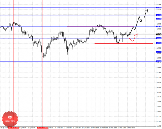 По паре Евро/Иена ключевыми уровнями являются: 133.01, 131.95, 131.45, 130.36, 128.69, 128.01, 126.77 и 125.46. Здесь продолжения движения кверху ожидаем после пробоя 130.36, в данном случае цель 131.45, в коридоре 131.45 – 131.95 консолидация цены. Потенциальным значением для верха по-прежнему считаем уровень 133.01, по достижении которого ожидаем откат книзу. Диапазон 128.69 – 128.01 является ключевой поддержкой для восходящей структуры от 15 апреля, в нем мы ожидаем краткосрочное нисходящее движение, пробой уровня 128.00 будет располагать к развитию нисходящей структуры, в данном случае первая цель – 126.77. Потенциальным значением для низа считаем уровень 125.46.