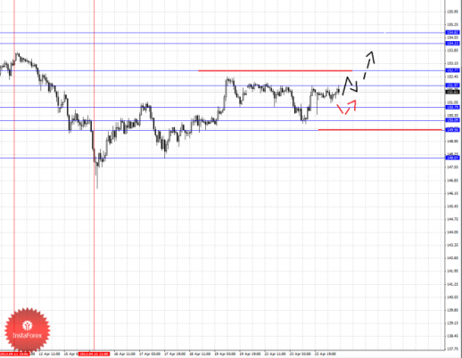 По паре Фунт/Иена ключевыми уровнями являются: 154.82, 154.23, 152.77, 151.97, 150.79, 150.09, 149.56 и 148.07. Здесь мы продолжаем следить за восходящей структурой от 15 апреля. Краткосрочное движение кверху, а также консолидацию, ожидаем в коридоре 151.97 – 152.77, пробой последнего значения должен сопровождаться выраженным восходящим движением, в данном случае цель 154.23. Потенциальным значением для верха пока считаем уровень 154.82, по достижении которого ожидаем консолидированное движение. Краткосрочное нисходящее движение возможно после пробоя 150.79, здесь цель 150.10. Коридор 150.09 – 149.56 является ключевой поддержкой для верха, его проход ценой будет располагать к развитию нисходящей структуры, в данном случае потенциальная цель – 148.07.