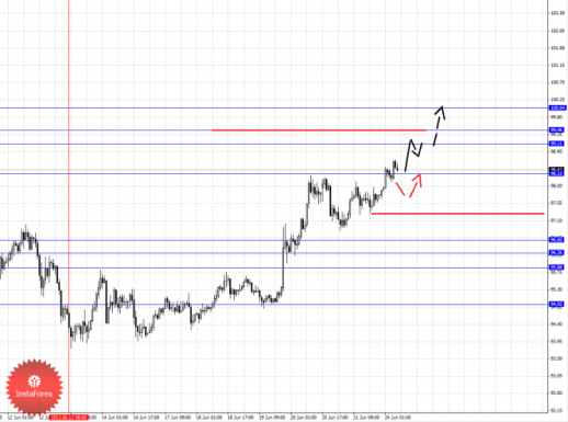 По паре Евро/Доллар продолжаем следить за формированием нисходящей структуры от 19 июня. По паре Доллар/Франк продолжения движения кверху ожидаем после пробоя 0.9395. По паре Фунт/Доллар следим за нисходящим циклом от 17 июня. По паре Доллар/Иена пока не наблюдаем каких-либо начальных условий для нисходящего движения и продолжаем следить за восходящей структурой от 13 июня. По паре Евро/Иена следим за восходящим циклом от 13 июня. По паре Фунт/Иена мы расширили потенциал для восходящей структуры от 13 июня.