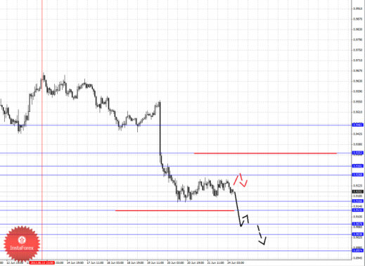 По паре Доллар/Франк ключевым уровня являются: 0.9552, 0.9497, 0.9465, 0.9393, 0.9364, 0.9321, 0.9304, 0.9274 и 0.9226. Здесь продолжения развития восходящей структуры от 13 июня ожидаем после прохода ценой шумового диапазона 0.9364–0.9393, в данном случае цель – 0.9465, в коридоре 0.9465–0.9497 консолидация цены. Потенциальным значением для верха считаем уровень 0.9552, по достижении которого ожидаем откат книзу. Краткосрочное нисходящее движение возможно в коридоре 0.9321–0.9304, пробой последнего значения приведет к углубленному движению, здесь цель 0.9274, от этого уровня мы ожидаем последний ключевой разворот кверху, его пробой будет располагать к развитию нисходящей структуры, в данном случае потенциальная цель – 0.9226.