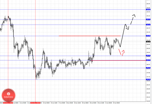 По паре Фунт/Иена ключевыми уровнями являются: 154.82, 153.72, 153.13, 151.89, 149.70, 149.20, 148.33 и 147.05. Здесь продолжения развития восходящей структуры от 13 июня ожидаем после пробоя 151.89, в данном случае цель 153.13, в коридоре 153.13–153.72 консолидация цены. Потенциальным значением для верха считаем уровень 154.82, движение к которому ожидаем после пробоя 153.72. Краткосрочное нисходящее движение возможно в коридоре 149.70–149.20, пробой последнего значения приведет к углубленному движению, здесь цель 148.33, от этого уровня возможен последний ключевой разворот кверху, его пробой будет располагать к формированию нисходящей структуры, в данном случае потенциальная цель – 147.05.