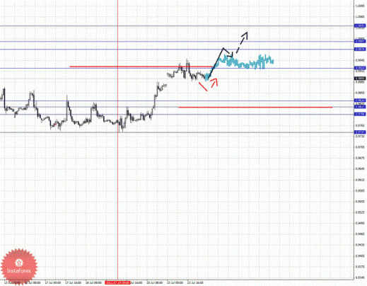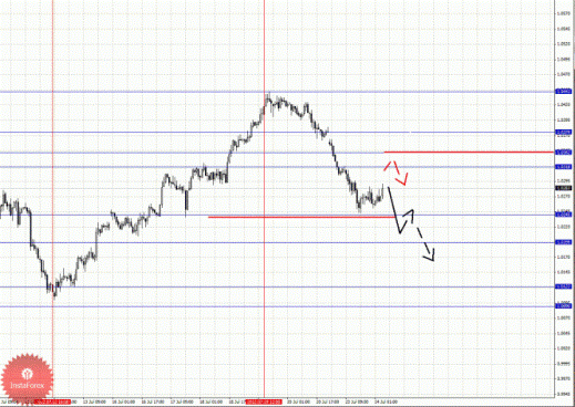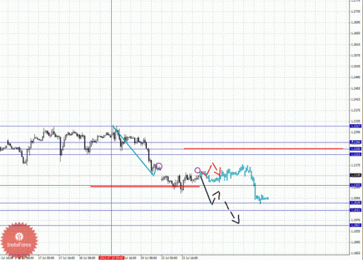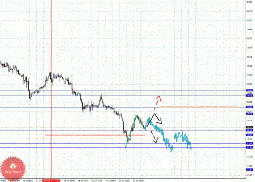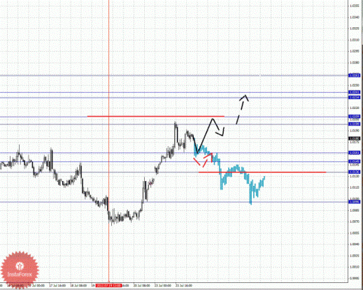 По парам Евро/Доллар и Доллар/Франк ключевые цели остались без изменения и мы продолжаем следить за структурой от 19 июля. По паре Фунт/Доллар нисходящую структуру от 19 июля рассматриваем в качестве потенциальных начальных условий. По паре Доллар/Иена от 23 июля наблюдается формирование структуры для верха, однако основной тенденцией здесь по-прежнему остается нисходящая. По паре Евро/Иена продолжаем следить за нисходящей тенденцией в масштабе Н1. По паре Фунт/Иена пока не наблюдаем выраженных начальных условий для восходящего движения.