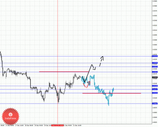 По паре Доллар/Франк ключевым уровня являются: 0.9230, 0.9209, 0.9197, 0.9181, 0.9138, 0.9127, 0.9116 и 0.9083. Здесь мы следим за формированием восходящей структуры от 20 декабря. Продолжения движения кверху ожидаем после пробоя 0.9181, в данном случае цель 0.9197, в коридоре 0.9197 – 0.9209 консолидация цены. Пробой уровня 0.9209 позволит рассчитывать на движение к потенциальной цели – 0.9230, по достижении этого уровня ожидаем консолидацию. Краткосрочное нисходящее движение возможно в коридоре 0.9138 – 0.9127, пробой последнего значения приведет к углубленному движению, здесь цель 0.9116, от этого уровня высока вероятность разворота кверху, его пробой приведет к отмене восходящей структуры от 20 декабря, в данном случае потенциальная цель – 0.9083.