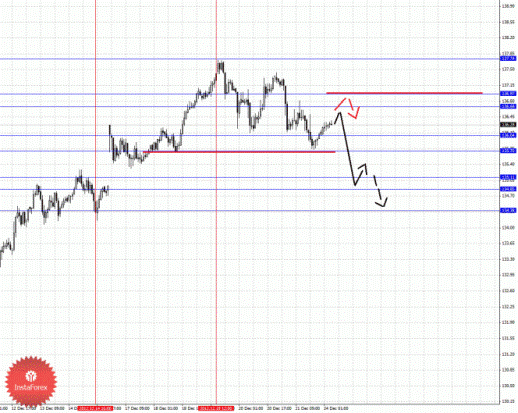 По паре Фунт/Иена ключевыми уровнями являются: 137.74, 136.97, 136.68, 136.04, 135.70, 135.11, 134.85 и 134.38. Здесь мы следим за формированием нисходящей структуры от 19 декабря. Краткосрочное нисходящее движение ожидаем в коридоре 136.04 – 135.70, пробой последнего значения приведет к развитию выраженного нисходящего движения, в данном случае цель 135.11, в коридоре 135.11 – 134.85 консолидация цены. Потенциальным значением для низа считаем уровень 134.38, по достижении которого ожидаем откат кверху. Краткосрочное восходящее движение возможно в коридоре 136.68 – 136.97, данный диапазон является ключевой поддержкой для нисходящей структуры, его проход ценой будет располагать к развитию восходящего движения, здесь потенциальная цель – 137.74.