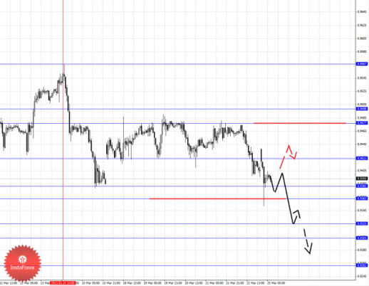 По паре Доллар/Франк ключевым уровня являются: 0.9567, 0.9498, 0.9477, 0.9423, 0.9382, 0.9363, 0.9325, 0.9303 и 0.9262. Здесь продолжения развития нисходящей структуры от 14 марта ожидаем после пробоя уровня 0.9423, в данном случае первая цель 0.9382, в коридоре 0.9382 – 0.9363 консолидация цены. Пробой уровня 0.9363 позволит рассчитывать на движение к 0.9325, в коридоре 0.9325 – 0.9303 консолидация цены. Потенциальным значением для низа считаем уровень 0.9262, по достижении которого ожидаем откат кверху. Краткосрочное восходящее движение возможно в коридоре 0.9477 – 0.9498, пробой последнего значения приведет к отмене нисходящей структуры от 14 марта, в данном случае потенциальная цель – 0.9567.