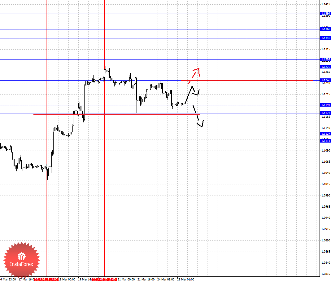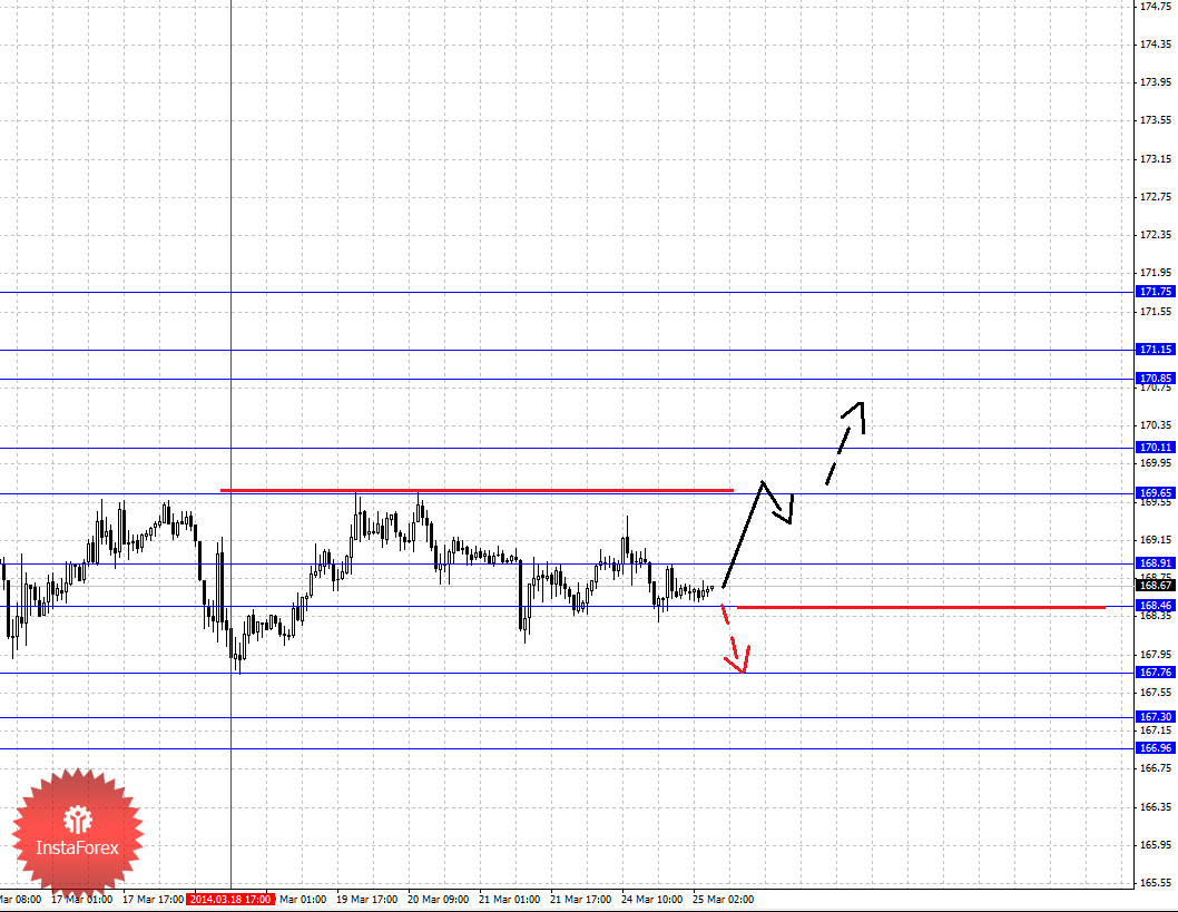 По паре Евро/Доллар и Доллар/Франк от 24 марта формируется потенциал для противоположного движения. По паре Фунт/Доллар продолжения движения книзу ожидаем после пробоя 1.6486. По паре Доллар/Иена продолжаем следить за восходящей структурой от 14 марта. По паре Евро/Иена цена находится в равновесном состоянии. По паре Фунт/Иена начальные условия для верха от 18 марта пока актуальны для определения целей.