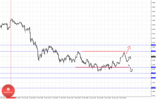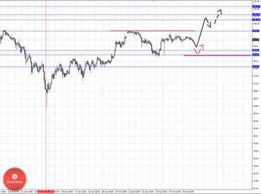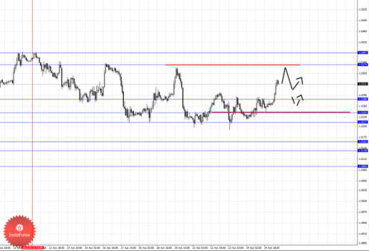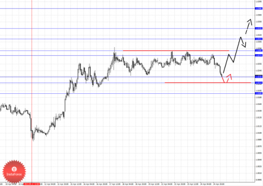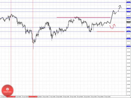 По паре Евро/Доллар продолжаем следить за нисходящей структурой от 16 апреля в качестве основной тенденции, движение кверху рассматриваем в роли корректировочного. По паре Доллар/Франк продолжаем следить за восходящим циклом от 16 апреля. По паре Фунт/Доллар цена близка к отмене нисходящей структуры от 12 апреля, однако пока мы не наблюдаем каких-либо начальных условий для верха. По паре Доллар/Иена продолжаем следить за восходящим движением от 15 апреля. По паре Евро/Иена и Фунт/Иена основные цели пока остаются без изменения.