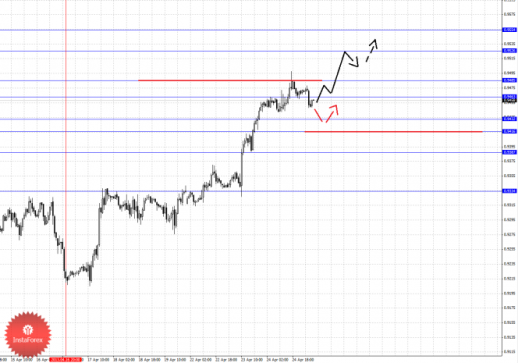 По паре Доллар/Канадский доллар ключевыми уровнями являются: 1.0380, 1.0335, 1.0311, 1.0285, 1.0274, 1.0226, 1.0213 и 1.0189. Здесь восходящую структуру от 11 апреля мы рассматриваем в качестве долгосрочных начальных условий. Продолжения движения кверху ожидаем после прохода ценой шумового диапазона 1.0274 – 1.0285, в данном случае цель 1.0311, пробой которого, в свою очередь, позволит рассчитывать на движение к 1.0335, возле этого уровня консолидация цены. Потенциальным значением для верха считаем уровень 1.0380, движение к которому ожидаем после пробоя 1.0335. Диапазон 1.0226 – 1.0213 является ключевой поддержкой для восходящей структуры, в нем ожидаем краткосрочное нисходящее движение, в также отсюда высока вероятность разворота кверху. Пробой уровня 1.0210 окажет негативное влияние на формирование восходящей тенденции в масштабе Н1, в данном случае потенциальная цель – 1.0189.