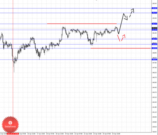 По паре Фунт/Иена ключевыми уровнями являются: 154.82, 154.23, 152.77, 151.97, 150.79, 150.09, 149.56 и 148.07. Здесь мы продолжаем следить за восходящей структурой от 15 апреля. Краткосрочное движение кверху, а также консолидацию ожидаем в коридоре 151.97 – 152.77, пробой последнего значения должен сопровождаться выраженным восходящим движением, в данном случае цель 154.23. Потенциальным значением для верха пока считаем уровень 154.82, по достижении которого ожидаем консолидированное движение. Краткосрочное нисходящее движение возможно после пробоя 150.79, здесь цель 150.10. Коридор 150.09 – 149.56 является ключевой поддержкой для верха, его проход ценой будет располагать к развитию нисходящей структуры, в данном случае потенциальная цель – 148.07.