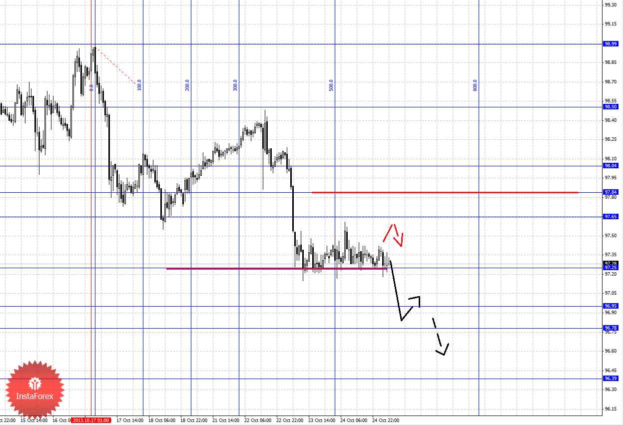 По паре Доллар/Иена ключевыми уровнями являются: 98.50, 98.04, 97.84, 97.65, 97.25, 96.95, 96.78 и 96.39. Здесь продолжения развития нисходящей структуры от 17 октября ожидаем после пробоя 97.25, в данном случае цель – 96.95, в коридоре 96.95 – 96.78 консолидация цены. Потенциальным значением для низа считаем уровень 96.39, по достижении которого ожидаем консолидацию, а также откат кверху. Краткосрочное восходящее движение возможно в диапазоне 97.65 – 97.84, пробой последнего значения приведет к углубленному движению, здесь цель – 98.04, от этого уровня мы ожидаем ключевой разворот книзу, его пробой будет располагать к развитию восходящей структуры, в данном случае потенциальная цель – 98.50.