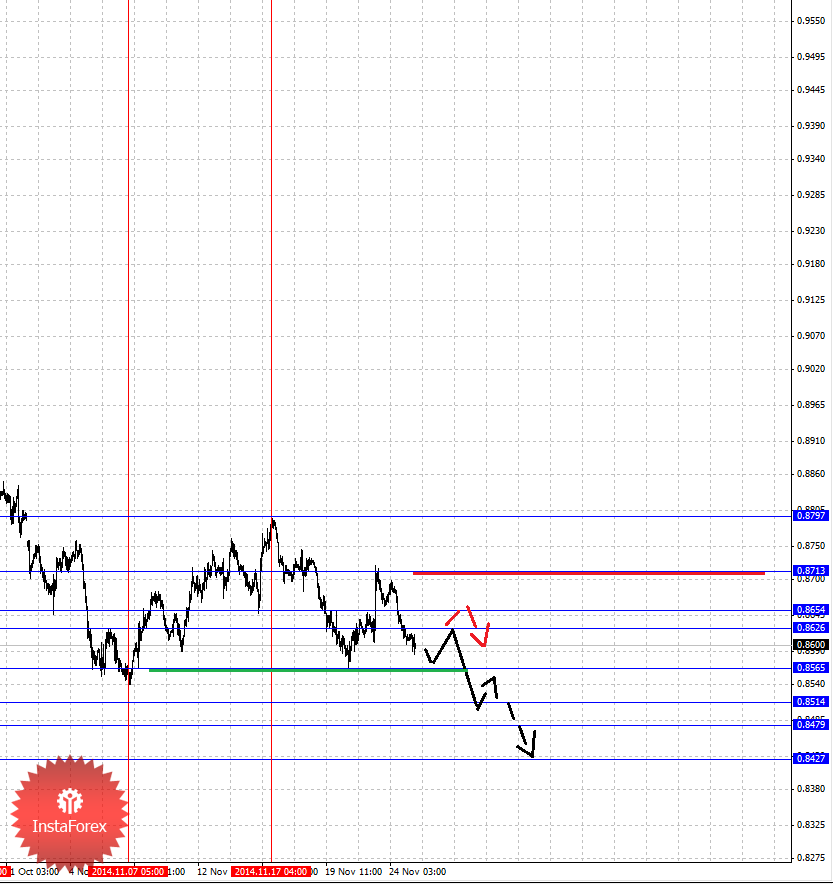 По паре Доллар/Франк ключевыми уровнями в масштабе Н1 являются: 0.9831, 0.9766, 0.9729, 0.9687, 0.9663 и 0.9621. Здесь, мы следим за развитием восходящей структуры от 19 ноября. Продолжения движения к верху, ожидаем после пробоя 0.9730, в данном случае цель – 0.9677, возле этого уровня консолидация цены. Пробой уровня 0.9766 позволит рассчитывать на движение к потенциальной цели – 0.9831, по достижении которого, ожидаем откат к низу. Консолидированное движение, ожидаем в коридоре 0.9687 – 0.9663, пробой последнего значения приведет к углубленной коррекции, здесь цель – 0.9621, этот уровень является ключевым сопротивлением для развития нисходящей структуры в масштабе Н1.