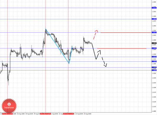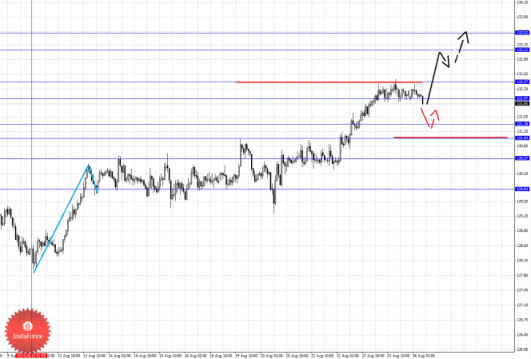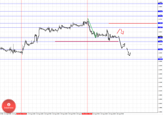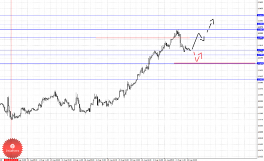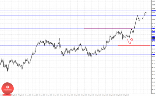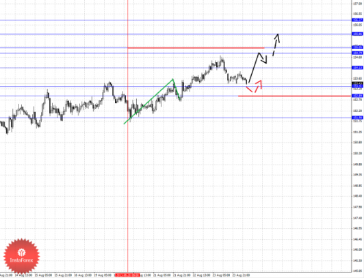 По паре Евро/Доллар основной структурой в масштабе Н1 пока считаем нисходящую от 20 августа, так как по Франку она имеет существенный вес. По паре Фунт/Доллар цена находится в корректировочной зоне от восходящего движения 2 августа. По паре Доллар/Иена следим за долгосрочной структурой 8 августа, выраженных локальных начальных условий для низа не наблюдается. По паре Евро/Иена следим за восходящим циклом от 12 августа. По паре Фунт/Иена отмены развития локальной структуры от 20 августа ожидаем после пробоя 152.89.