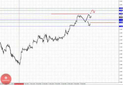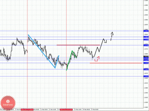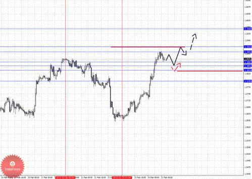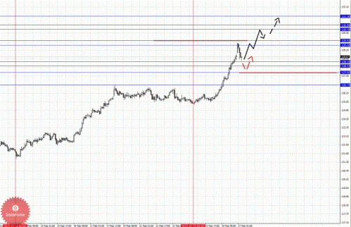 По паре Евро/Доллар мы, преимущественно, ожидаем выполнения коррекции книзу. По паре Доллар/франк также высока вероятность выполнения отката кверху, несмотря на отсутствия начальных условий. По Фунту следим за развитием небольшого восходящего цикла от 23 февраля. По паре Доллар/Йена от 23 февраля оформилась локальная структура для верха. По паре Евро/Йена ожидаем откат книзу, на текущий момент цена достигла предел 423.6. По паре Фунт/Йена возможно продолжение движения кверху после пробоя 129.82.