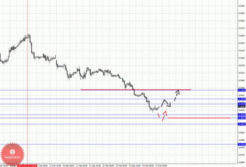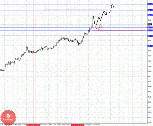 По паре Доллар/Йена ключевыми уровнями являются: 82.28, 81.93, 81.64, 80.92, 80.75, 80.43 и 79.84. Здесь мы следим за развитием локальной восходящей структуры от 23 февраля. Продолжения движения кверху ожидаем после пробоя 81.64, в данном случае цель 81.93, возле этого уровня консолидация. Потенциальным значением для верха считаем уровень 82.28, по достижении которого ожидаем откат книзу. Краткосрочное нисходящее движение возможно в коридоре 80.92 – 80.75, пробой последнего значения приведет к углубленной коррекции, здесь цель 80.43, от этого уровня высока вероятность разворота кверху, его пробой будет располагать к развитию нисходящей тенденции в масштабе Н1, в данном случае потенциальная цель – 79.84.