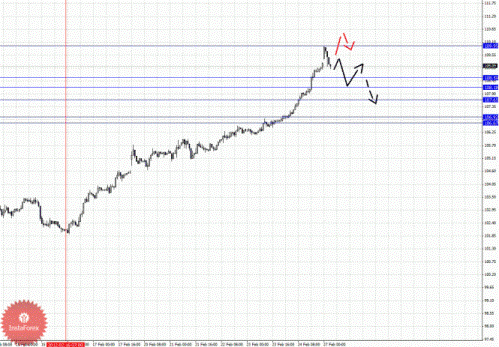 По паре Евро/Йена ключевыми уровнями являются: 109.95, 108.59, 108.18, 107.65, 106.92 и 106.67. Здесь мы ожидаем выполнения коррекции книзу от восходящей структуры 16 февраля. Пробой уровня 109.95 будет сопровождаться краткосрочным восходящим движением, в данном случае цели не определены. Корректировочное нисходящее движение ожидаем в коридоре 108.59 – 108.18, пробой последнего значения приведет к углубленной коррекции, в данном случае цель 107.65, от этого уровня возможен разворот кверху, его пробой будет располагать к дальнейшему развитию нисходящей структуры, здесь потенциальная цель 106.92. Диапазон 106.92 – 106.67 шумовой и выполняет роль ключевой поддержки для верха.
