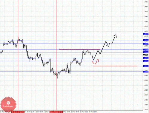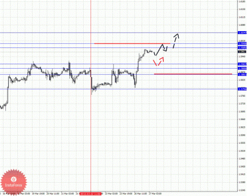 По паре Фунт/Доллар ключевыми уровнями являются: 1.6047, 1.5998, 1.5980, 1.5907, 1.5888, 1.5861 и 1.5796. Здесь мы продолжаем следить за локальной структурой от 22 марта. Продолжения движения кверху ожидаем после прохода ценой шумового диапазона 1.5980 – 1.5998, в данном случае потенциальная цель 1.6047, по достижении этого уровня ожидаем консолидацию, а также откат книзу. Корректировочное нисходящее движение возможно в коридоре 1.5907 – 1.5888, пробой последнего значения приведет к углубленной коррекции, здесь цель 1.5861, от этого уровня высока вероятность разворота кверху, его пробой окажет негативное влияние на развитие восходящей тенденции в масштабе Н1, в данном случае потенциальная цель – 1.5796.