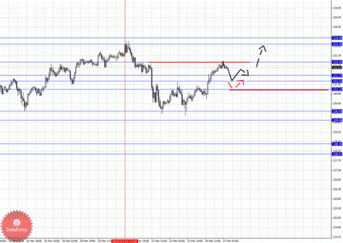 По паре Фунт/Йена ключевыми уровнями являются: 133.54, 133.26, 132.41, 131.77, 131.51, 131.13, 130.09, 129.68, 128.54 и 128.07. Здесь продолжения движения кверху ожидаем после пробоя 132.41, в данном случае цель 133.26, в диапазоне 133.26 – 133.54 консолидация цены. Корректировочное нисходящее движение возможно в коридоре 131.77 – 131.51, пробой последнего значения приведет к углубленной коррекции, здесь цель 131.13, от этого уровня высока вероятность разворота кверху, его пробой будет располагать к дальнейшему развитию нисходящей структуры от 21 марта, в данном случае первая цель 130.09. Далее уровни для низа остались без изменения.