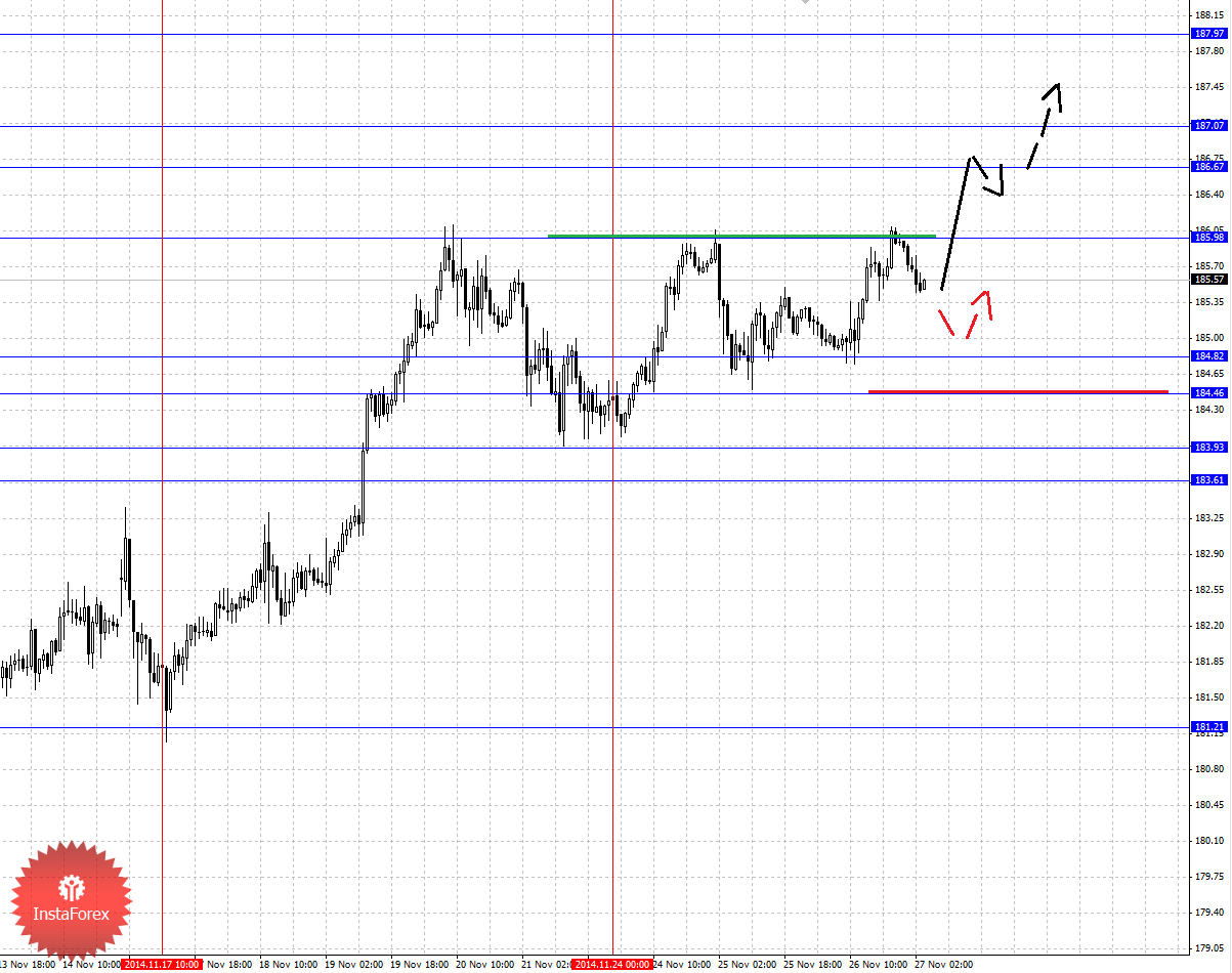 По паре Фунт/Иена ключевыми уровнями в масштабе Н1 являются: 187,97 187.07, 186.67, 185.98, 184.82, 184.46, 183.93 и 183.61. Здесь, мы ожидаем развитие локальной восходящей структуры от 24 ноября. Продолжения движения к верху, ожидаем после пробоя 185.98, в данном случае цель – 186.67, в коридоре 186.67 – 187.07 консолидация цены. Потенциальным значением для верха, пока считаем уровень – 187.97, по достижении которого, ожидаем консолидацию. Краткосрочное нисходящее движение, возможно в коридоре 184.82 – 184.46, пробой последнего значения будет располагать к развитию нисходящей структуры, здесь цель – 183.93. Диапазон 183.93 – 183.61 шумовой.